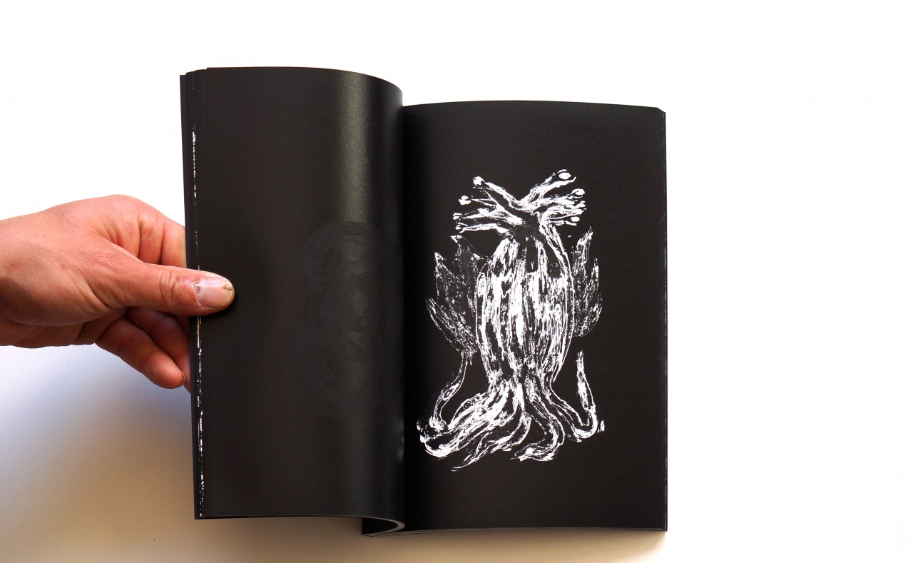 HIDEOUS est la suite d’un travail de recherche autour de la sérigraphie sans procédé d’insolation amorcé avec le livre Astral Disaster par ces auteurs en 2013, travaillant à même le cadre au bouche pore.